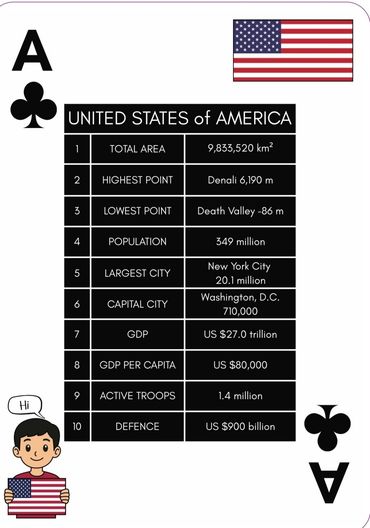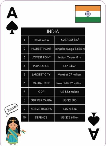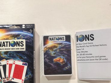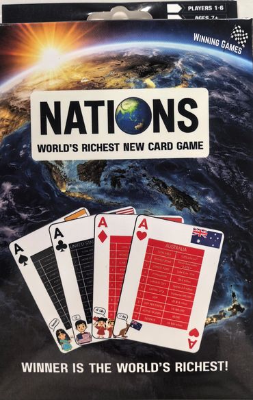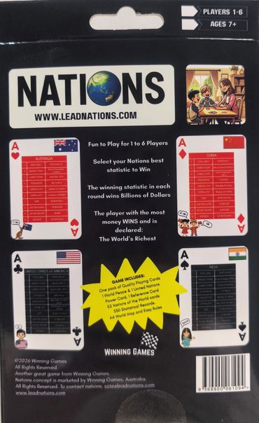 Game includes: 1 pack of quality playing cards with 52 Nations playing cards. A3 World map and easy rules.